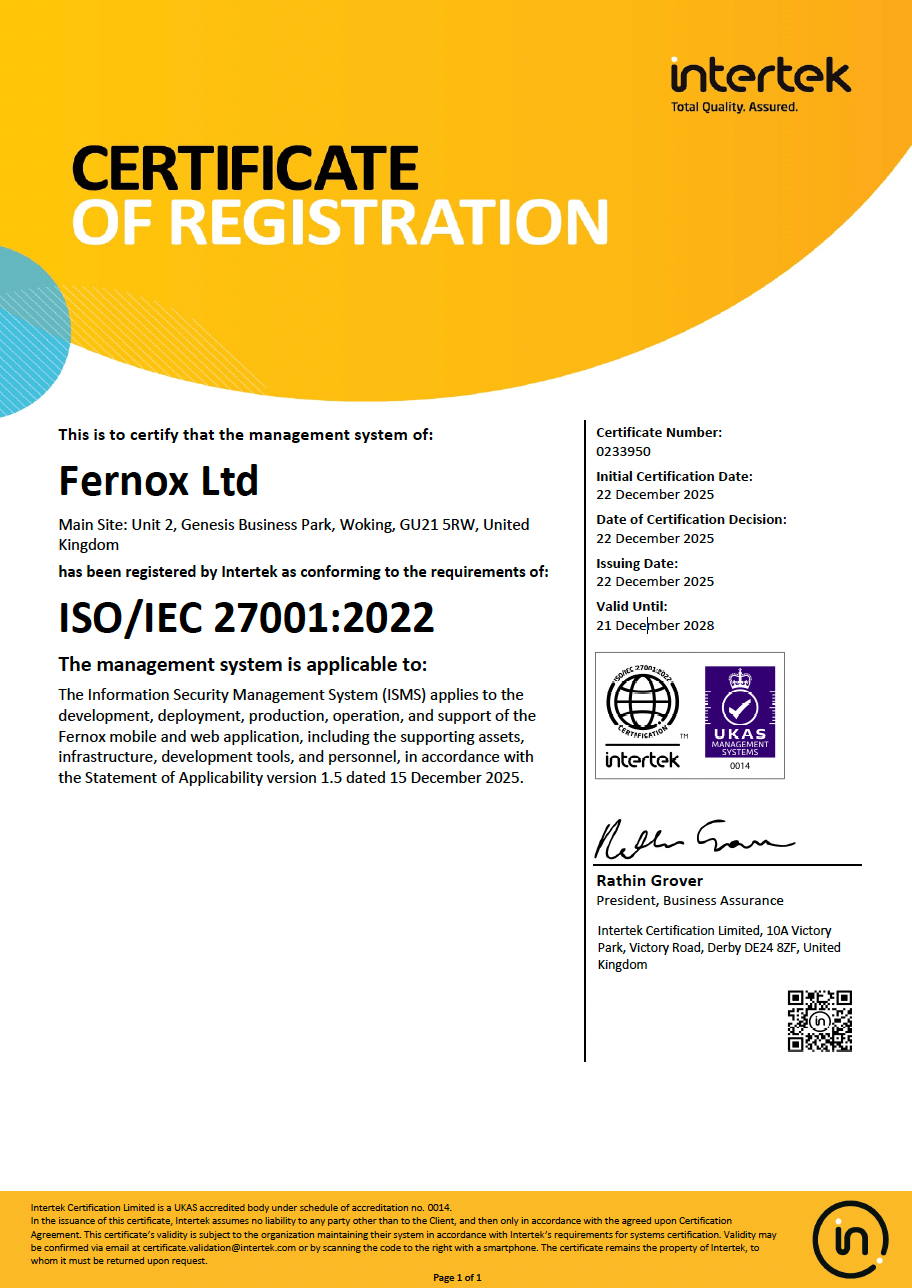 The Information Security Management System (ISMS) covering the development, deployment, production, operation, and support of the Fernox mobile and web application, including supporting assets, infrastructure, development tools, and personnel, in accordance with Statement of Applicability version 1.5 dated 15 December 2025.